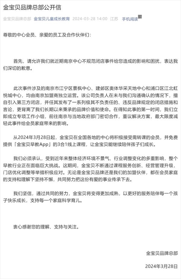 ·連鎖早教機構金寶貝多地門店停業(yè),家長遭遇退款難,金寶貝總部回應致歉。