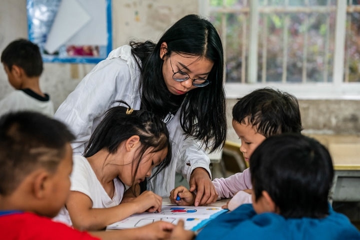 ?在云南省文山州文山市馬塘鎮(zhèn)新開(kāi)田村委會(huì)新開(kāi)田一隊(duì),志愿者楊紅非在“少年兒童之家”教孩子們繪畫(2022年8月9日攝)。
