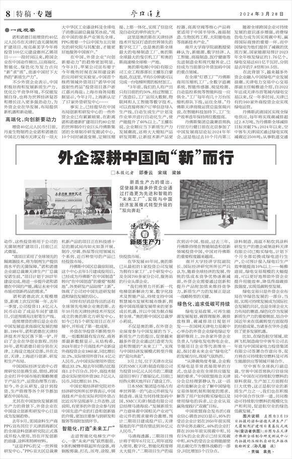 不少外資企業(yè)表示,中國積極培育和發(fā)展新質(zhì)生產(chǎn)力,優(yōu)化公平競(jìng)爭(zhēng)環(huán)境,不僅能發(fā)展自身,也將為世界經(jīng)濟(jì)復(fù)蘇和增長注入更多強(qiáng)勁動(dòng)力,為外資企業(yè)在華發(fā)展、布局提供新機(jī)遇和新動(dòng)能。