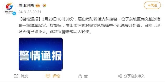 央視網(wǎng)消息:據(jù)眉山消防官微通報(bào),3月28日18時(shí)30分,四川眉山消防救援支隊(duì)接警,位于東坡區(qū)尚義鎮(zhèn)劉廟路一油罐車(chē)起火。接警后,眉山市消防救援支隊(duì)指揮中心迅速展開(kāi)處置。目前,現(xiàn)場(chǎng)火情已被撲滅。此次火情造成兩人輕傷。