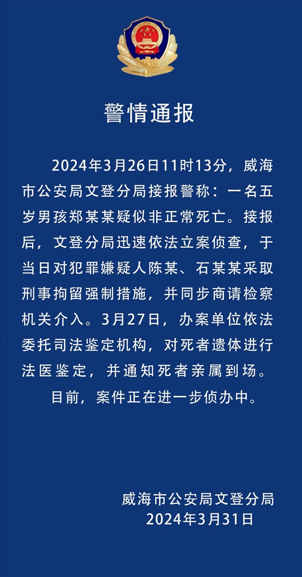 ·山東威海警方通報(bào)5歲男童疑被打致死事件:兩名犯罪嫌疑人被刑拘。