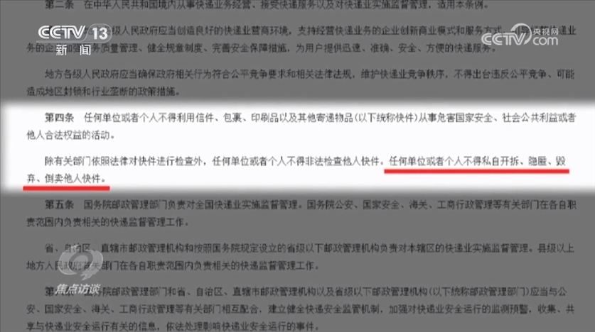 國(guó)務(wù)院頒布的《快遞暫行條例》第四條明確規(guī)定:“任何單位或者個(gè)人不得私自開(kāi)拆、隱匿、毀棄、倒賣(mài)他人快件?!?/p>