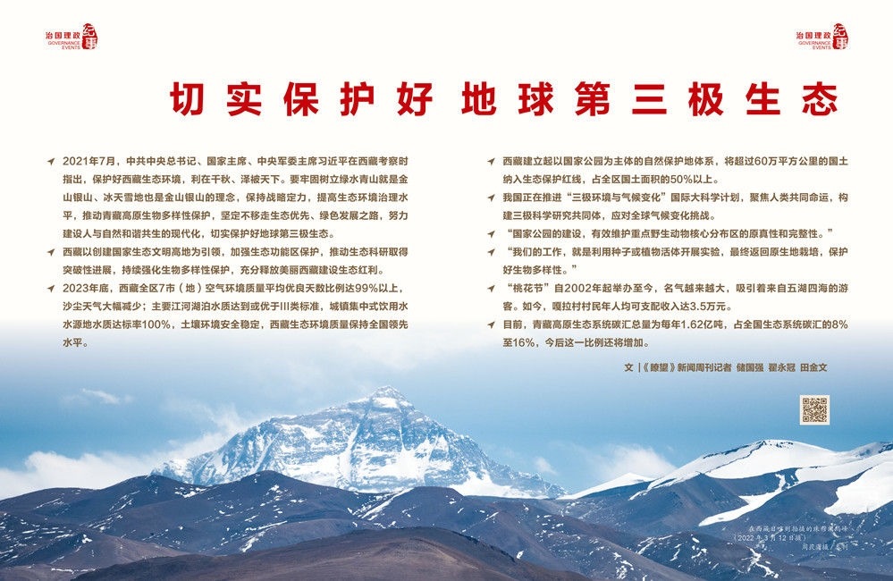 ◇2021年7月,中共中央總書記、國家主席、中央軍委主席習近平在西藏考察時指出,保護好西藏生態(tài)環(huán)境,利在千秋、澤被天下。要牢固樹立綠水青山就是金山銀山、冰天雪地也是金山銀山的理念,保持戰(zhàn)略定力,提高生態(tài)環(huán)境治理水平,推動青藏高原生物多樣性保護,堅定不移走生態(tài)優(yōu)先、綠色發(fā)展之路,努力建設人與自然和諧共生的現(xiàn)代化,切實保護好地球第三極生態(tài)。
