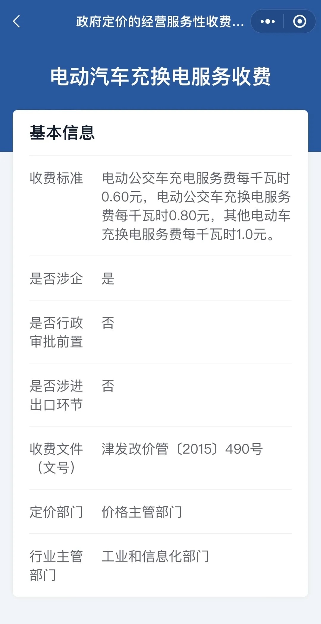 點擊定價項目名稱,就會看到具體的收費標(biāo)準(zhǔn)、收費文件、定價部門、行業(yè)主管部門、是否涉企等多項信息。