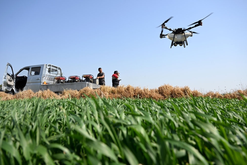 2024年3月22日,在安徽省合肥市廬江縣同大鎮(zhèn),工作人員操作植保無人機為小麥施肥。新華社記者 黃博涵 攝