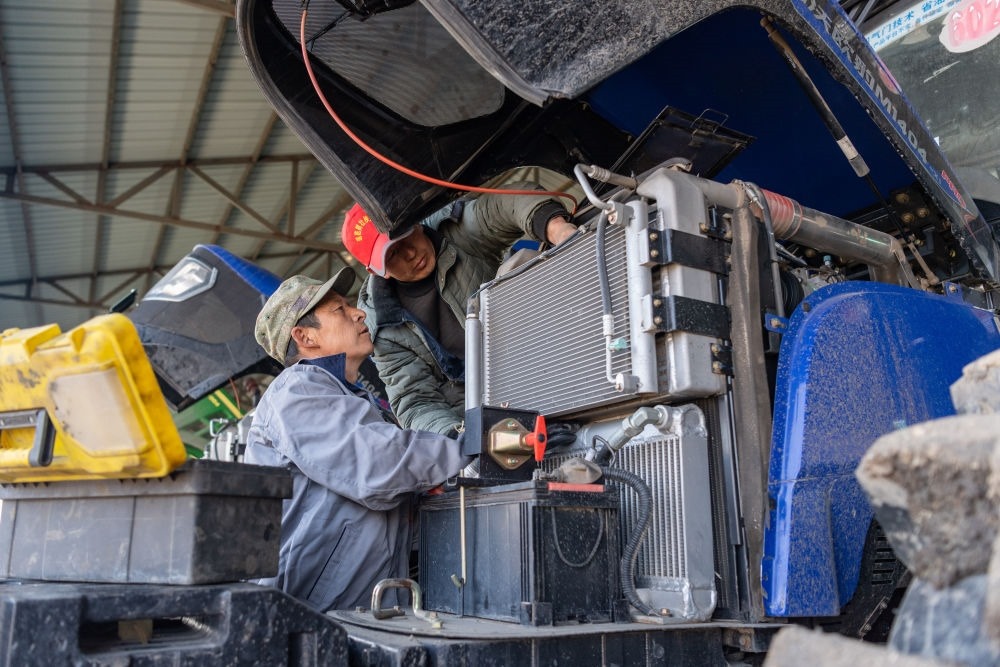 2024年4月3日,在黑龍江省勃利縣一家水稻種植專業(yè)合作社,工作人員在檢修農(nóng)機。新華社記者 謝劍飛 攝