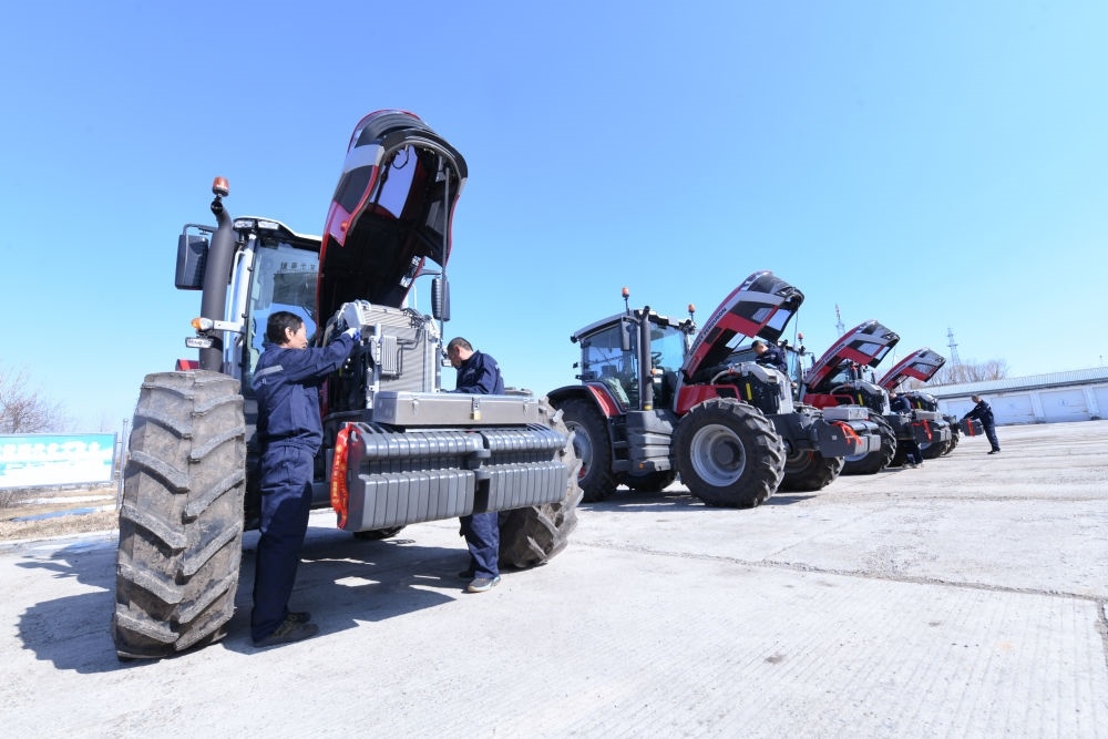 2024年3月22日,在北大荒集團建設(shè)農(nóng)場有限公司,農(nóng)機手對新引進的拖拉機進行調(diào)試。新華社記者 王松 攝
