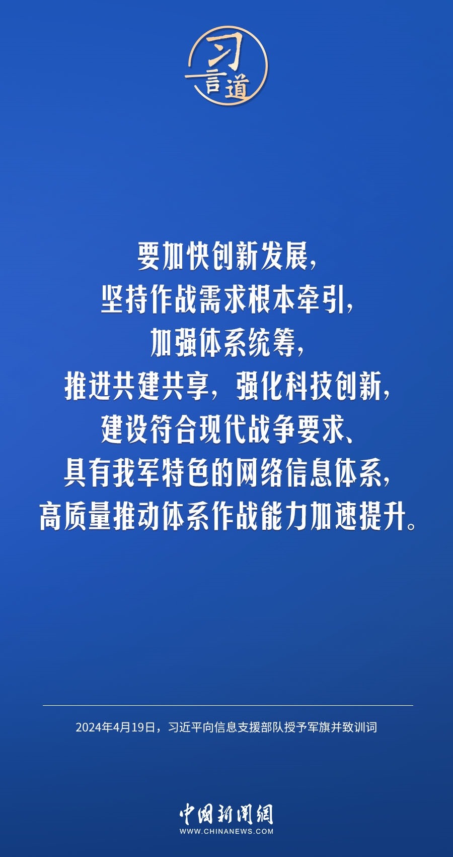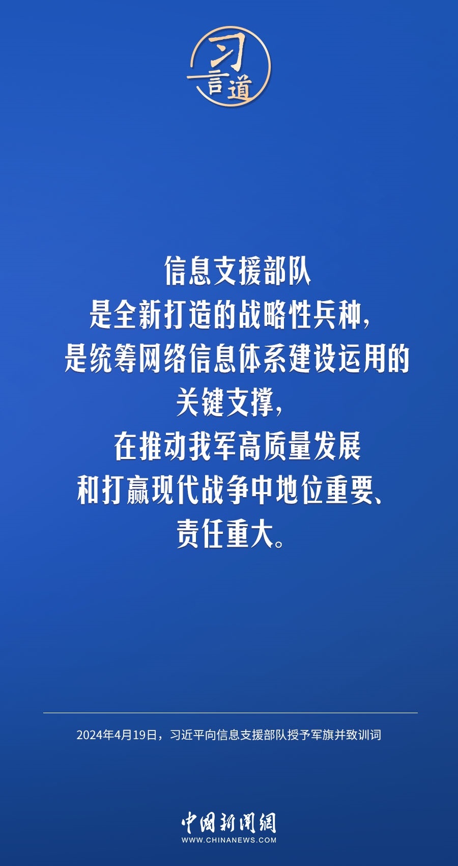 中國人民解放軍信息支援部隊成立大會19日在北京八一大樓隆重舉行。中共中央總書記、國家主席、中央軍委主席習(xí)近平向信息支援部隊授予軍旗并致訓(xùn)詞,代表黨中央和中央軍委向信息支援部隊全體官兵致以熱烈祝賀。他強(qiáng)調(diào)——