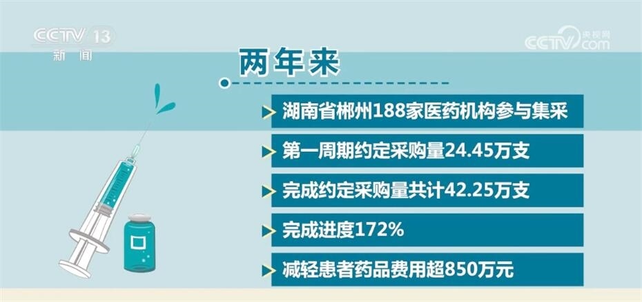 兩年來,湖南省郴州188家醫(yī)藥機構(gòu)參與集采,第一周期約定采購量24.45萬支,完成約定采購量共計42.25萬支,完成進度172%,減輕患者藥品費用超850萬元。