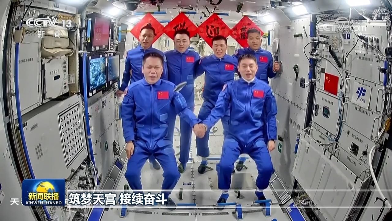隨后,兩個(gè)航天員乘組拍下“全家福”,共同向牽掛他們的全國(guó)人民報(bào)平安。