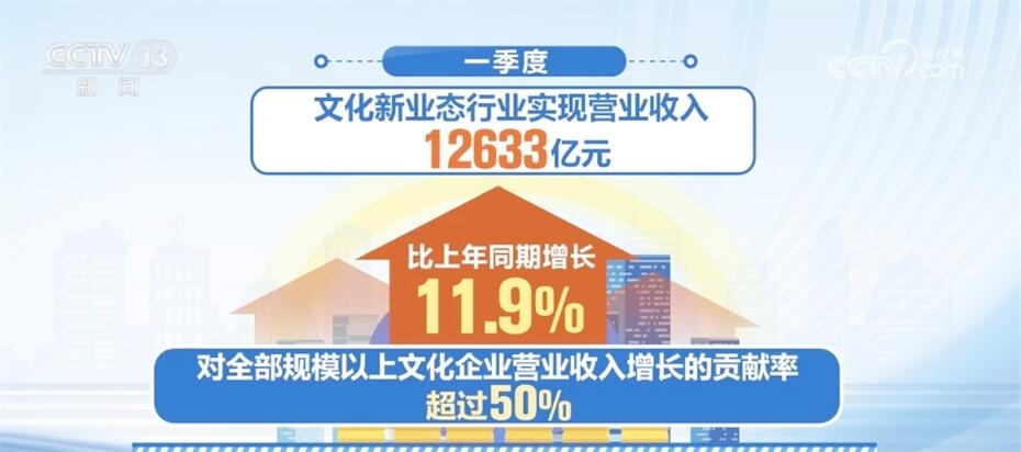 文化新業(yè)態(tài)行業(yè)持續(xù)發(fā)揮帶動(dòng)效應(yīng),一季度,文化新業(yè)態(tài)行業(yè)實(shí)現(xiàn)營(yíng)業(yè)收入12633億元,比上年同期增長(zhǎng)11.9%,對(duì)全部規(guī)模以上文化企業(yè)營(yíng)業(yè)收入增長(zhǎng)的貢獻(xiàn)率超過(guò)50%。