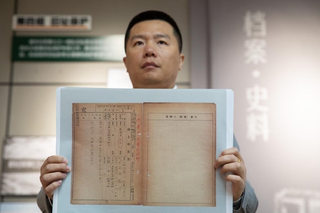 侵華日軍第七三一部隊罪證陳列館研究人員展示《身上申告書》(影印件)(4月29日攝)。新華社記者 張濤 攝