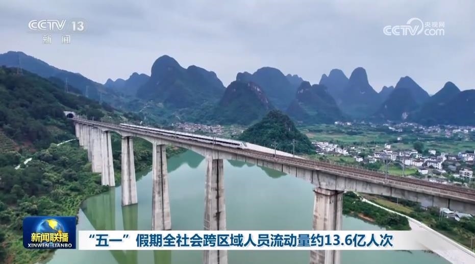初步統(tǒng)計顯示,5月1日—5日,全社會跨區(qū)域人員流動量預(yù)計約13.6億人次,日均超2.7億人次,比2019年同期增長24.1%。