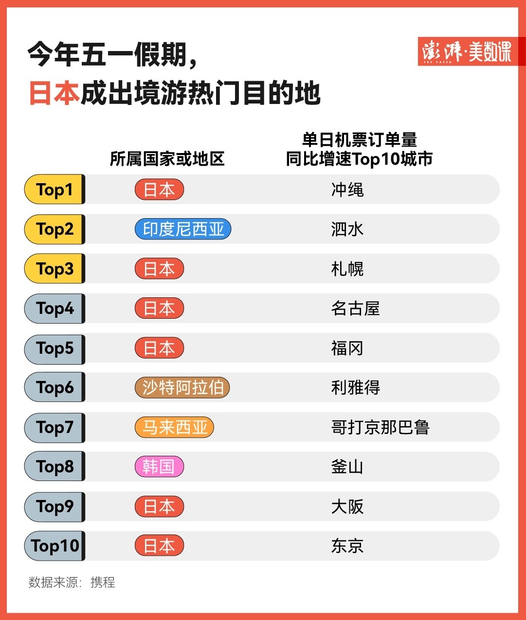 除了國內旅游市場的火爆之外,“五一”出境游已經加快復蘇。從攜程提供的數(shù)據看,今年“五一”假期,日本成了出境游熱門目的地——相比2023年同期,單日機票訂單量同比增速Top10的城市中,日本的沖繩、札幌、名古屋等城市分別占據了六個席位。
