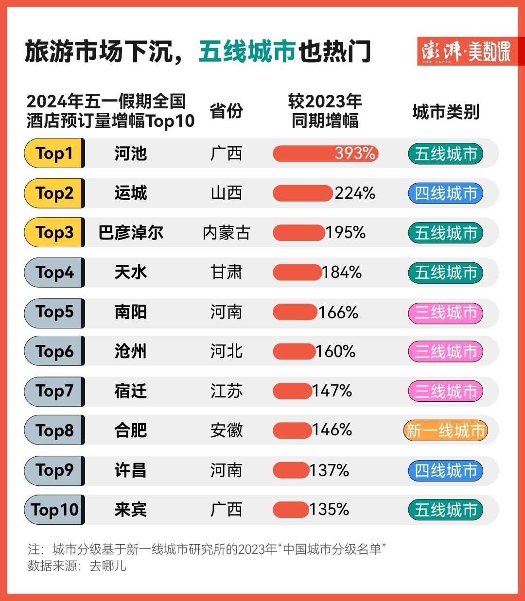 從去哪兒的數(shù)據來看,這個假期里酒店預訂量增幅前十名的城市幾乎都是三線、四線或五線城市,其中五線城市河池以393%的同比增幅領跑全國,其次是山西運城、內蒙古巴彥淖爾。