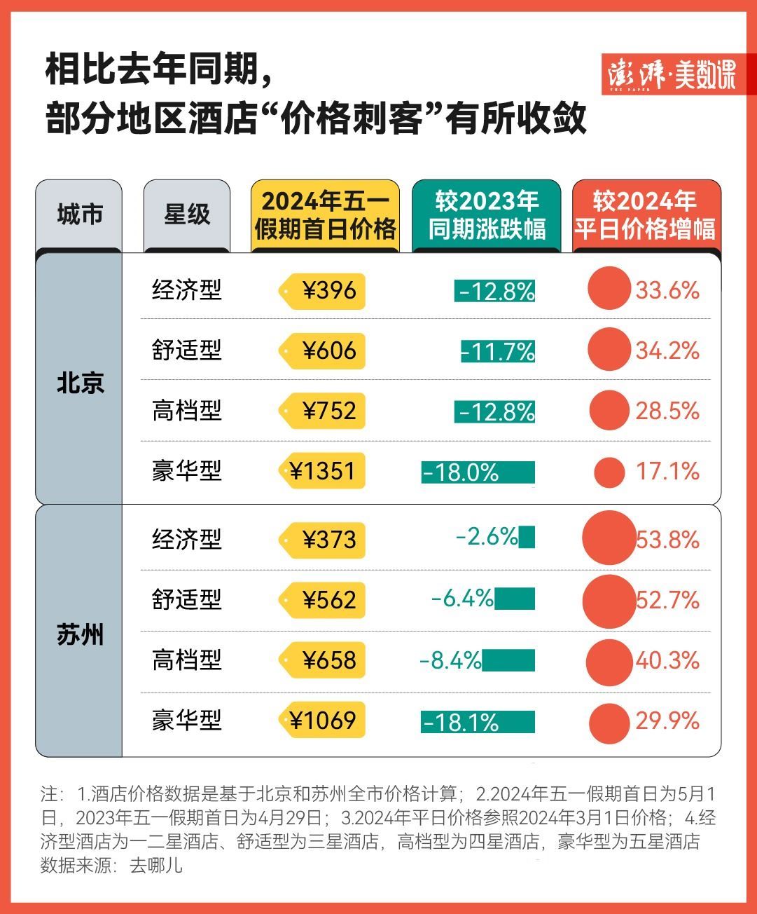 從去哪兒平臺提供的數(shù)據來看,在今年“五一”假期的首日,北京和蘇州的經濟型酒店相比平日價格分別漲了三成和五成左右,難怪在社交媒體上總能看到“五一不是不出門,是酒店住不起”的吐槽聲。