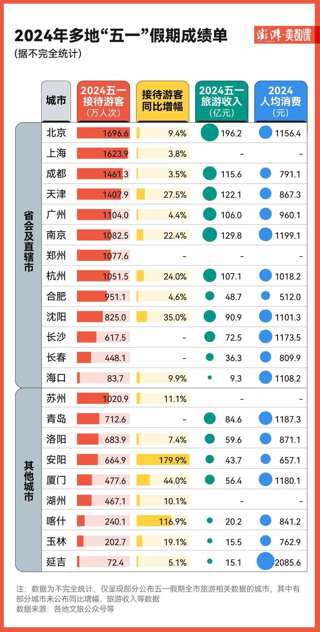 不過,像是北京、上海、成都、天津等城市依然是熱門的旅游目的地。在目前已公布“五一”假期數(shù)據的省會及直轄市中,北京、上海就以1696.6萬、1623.9萬接待游客人次名列前茅。