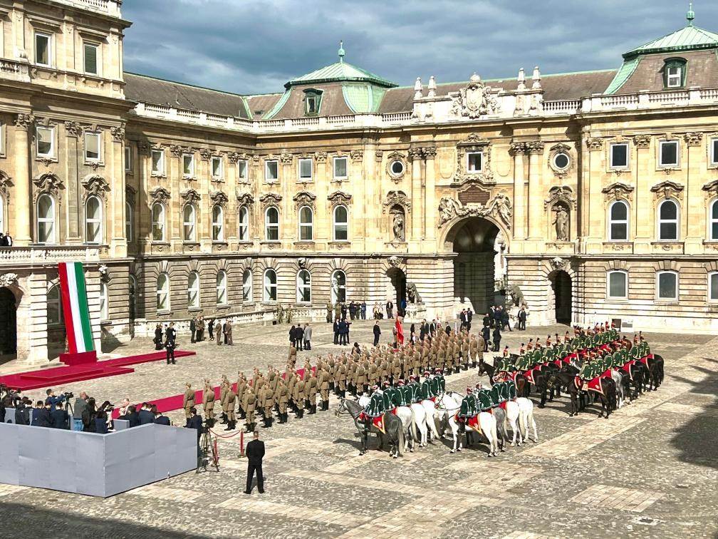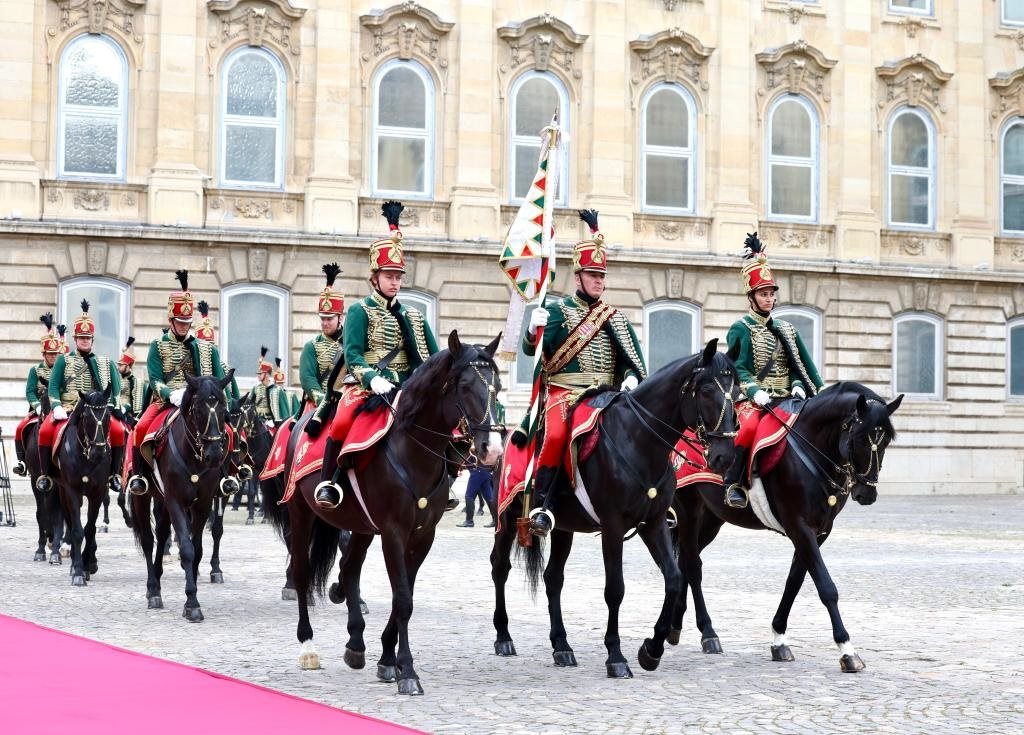 初夏時(shí)節(jié)的布達(dá)佩斯陽(yáng)光明媚,古老宏偉的布達(dá)王宮莊嚴(yán)矗立,中匈兩國(guó)國(guó)旗相映成輝。習(xí)近平和夫人彭麗媛乘坐的國(guó)賓車隊(duì)在匈牙利禮賓馬隊(duì)護(hù)衛(wèi)下緩緩駛?cè)氩歼_(dá)王宮內(nèi)庭。舒尤克總統(tǒng)夫婦和歐爾班總理夫婦熱情迎接。