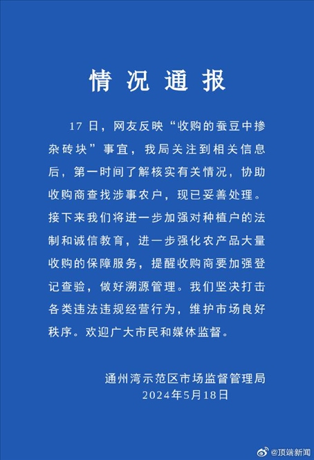 ·網友反映“收購的蠶豆中摻雜磚塊”,南通發(fā)布情況通報。