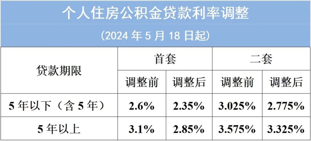 5月17日,中國人民銀行決定,自2024年5月18日起,下調個人住房公積金貸款利率0.25個百分點,5年以下(含5年)和5年以上首套個人住房公積金貸款利率分別調整為2.35%和2.85%,5年以下(含5年)和5年以上第二套個人住房公積金貸款利率分別調整為不低于2.775%和3.325%。