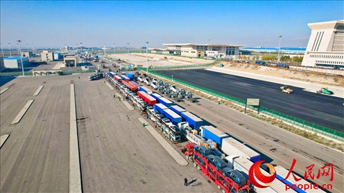 霍爾果斯公路口岸,等待通關(guān)的汽車。人民網(wǎng) 李欣洋攝