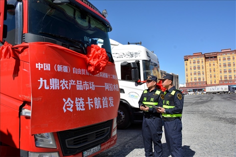 5月10日,一輛滿載蘋果的冷鏈運輸車從烏魯木齊市發(fā)車前往哈薩克斯坦阿拉木圖市。這是新疆首次實現(xiàn)果蔬冷鏈卡航直達(dá)中亞市場。圖為烏昌海關(guān)關(guān)員對冷鏈卡航模式出口鮮蘋果進(jìn)行驗放。楊逸萌攝