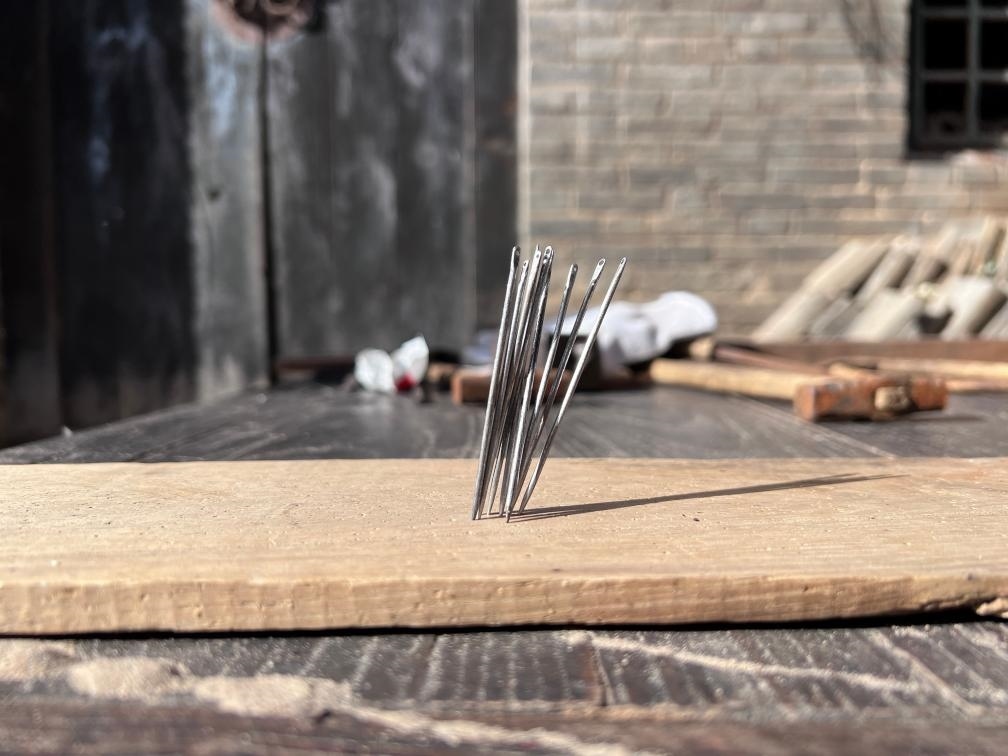 傳承人裴向南的主業(yè)是鄉(xiāng)村醫(yī)生,如今利用節(jié)假日和業(yè)余時間為大陽古鎮(zhèn)的游客展演古法制針,人們可以在這里感受非遺魅力、追尋歷史印記?!懊恳幻妒止や撫樁际仟氁粺o二的。”他說,大陽的鋼針來之不易,一定要用心傳承好。話音未落,裴向南捏起一小撮鋼針,信手一甩,一排明晃晃的鋼針齊刷刷地扎在了木板上。