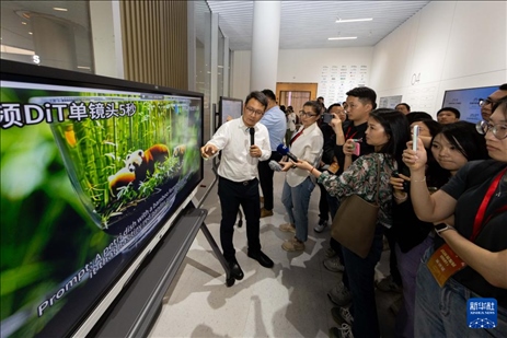 ?5月23日,大模型企業(yè)、智象未來生態(tài)合作部總經(jīng)理沈偉峰為采訪團(tuán)介紹運用大模型文生視頻。新華社記者 王翔 攝