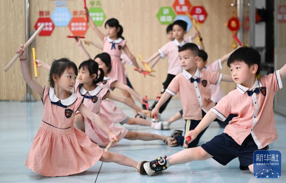 5月29日,在汕頭市貴嶼鎮(zhèn)北林保嬰幼兒園,莊恩琪練習跳英歌舞。