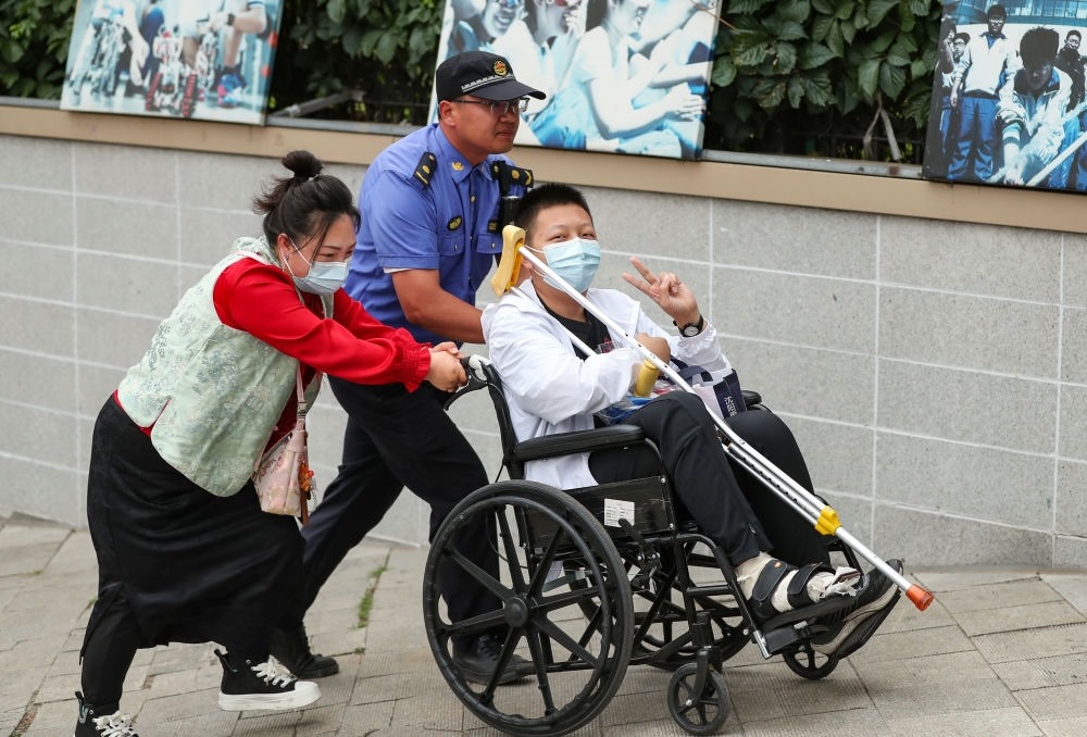 ↑6月7日,一位行動(dòng)不便的考生在家人和沈陽市城市管理綜合行政執(zhí)法局工作人員的幫助下抵達(dá)沈陽市第五中學(xué)考點(diǎn)。