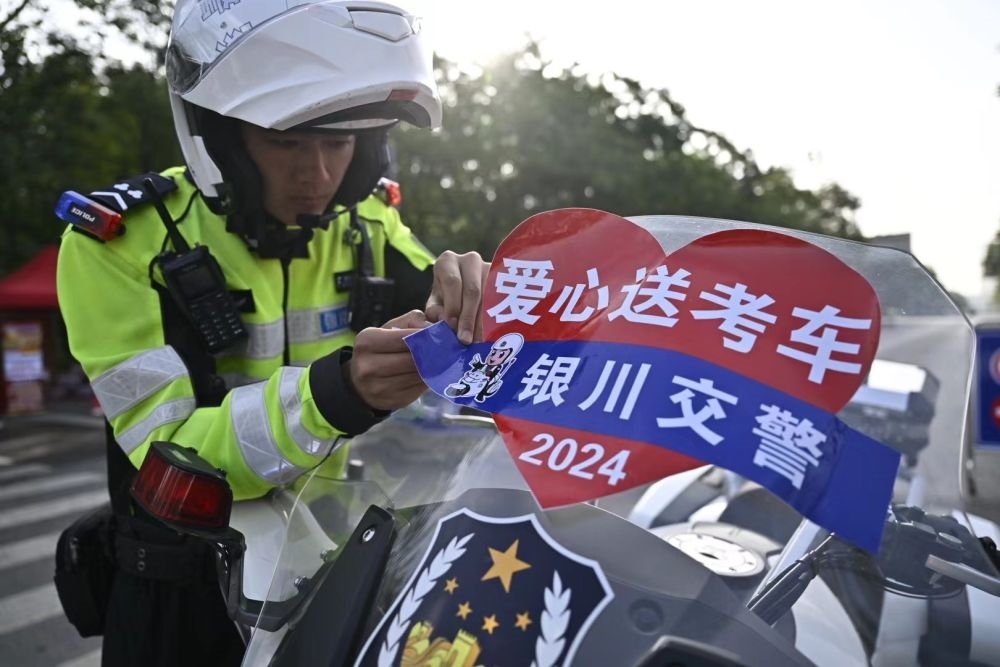 ↑6月7日,寧夏銀川市公安局交通警察分局興慶區(qū)交警一大隊(duì)民警在準(zhǔn)備愛心送考車輛。