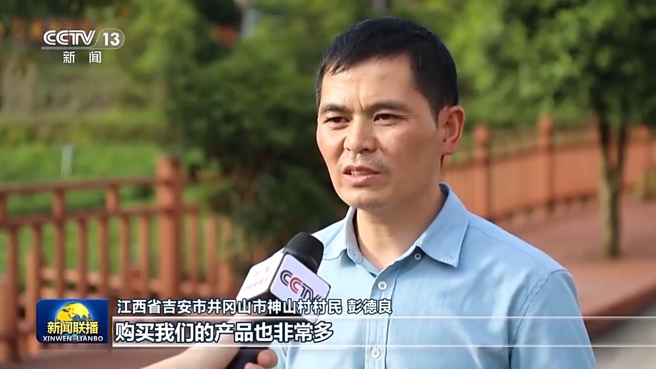 江西省吉安市井岡山市神山村村民 彭德良:游客越來越多,購買我們的產品也非常多,給我們增加了很大的收入。