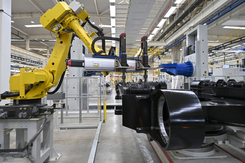 2024年4月9日,在山西太原太重集團(tuán)智能高端液壓挖掘機(jī)產(chǎn)業(yè)園區(qū),智能裝配機(jī)器人在智能生產(chǎn)線上作業(yè)。