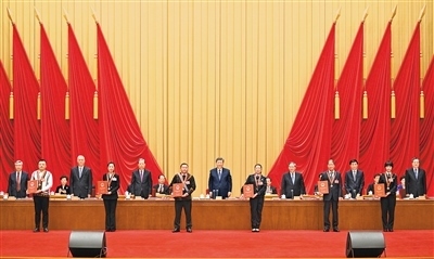 在歡快的樂(lè)曲聲中,習(xí)近平等為受表彰的模范個(gè)人和模范集體代表頒獎(jiǎng)。