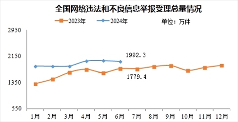 來(lái)自中央網(wǎng)信辦舉報(bào)中心的消息,2024年6月,中央網(wǎng)信辦舉報(bào)中心指導(dǎo)全國(guó)各級(jí)網(wǎng)信舉報(bào)工作部門、主要網(wǎng)站平臺(tái)受理網(wǎng)民舉報(bào)色情、賭博、侵權(quán)、謠言等違法和不良信息1992.3萬(wàn)件,環(huán)比下降1.3%、同比增長(zhǎng)12%。