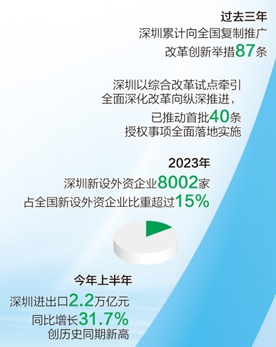 改革開放釋放澎湃動能。深圳發(fā)布支持外商投資生物醫(yī)藥領(lǐng)域、實施跨境貿(mào)易投資高水平開放政策試點等20條措施,出臺優(yōu)化國際化營商環(huán)境工作方案,持續(xù)提升對全球優(yōu)質(zhì)要素資源的強大吸引力。去年全年,深圳新設(shè)外資企業(yè)8002家,占全國新設(shè)外資企業(yè)比重超過15%;今年上半年,深圳進(jìn)出口總額2.2萬億元,同比增長31.7%,創(chuàng)深圳歷史同期新高。