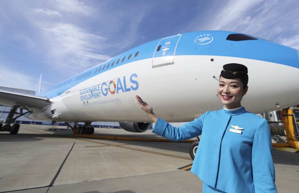 2018年1月26日,在美國查爾斯頓波音工廠,中國廈門航空公司的一名空乘人員展示廈航首架涂裝宣傳聯合國可持續(xù)發(fā)展目標的客機。新華社記者 王迎 攝