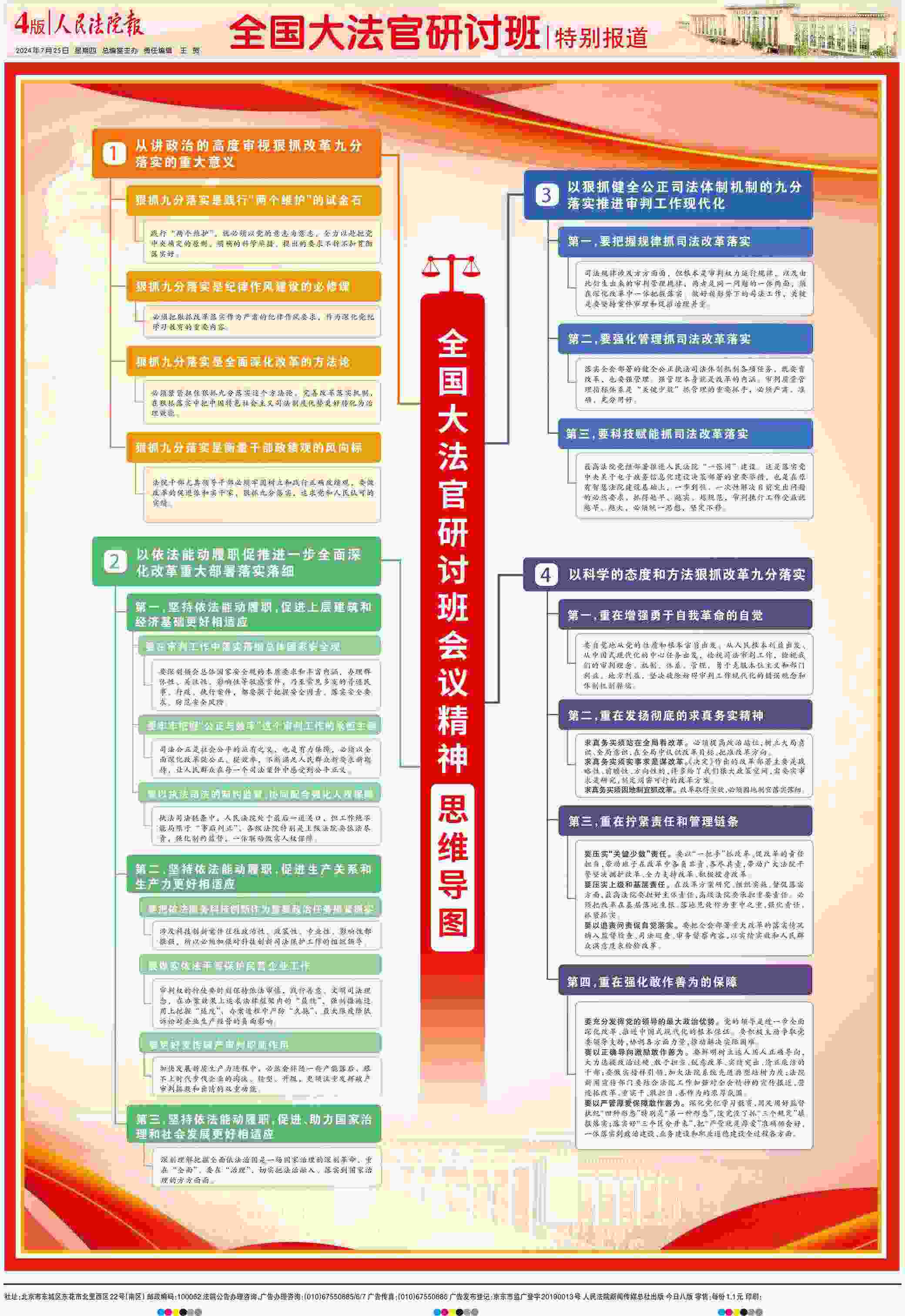 7月24日,全國大法官研討班舉行。此次研討班的主要任務是:堅持以習近平新時代中國特色社會主義思想為指導,全面貫徹落實黨的二十大和二十屆二中、三中全會精神,深入貫徹習近平法治思想,認真學習領會黨中央關于進一步全面深化改革的戰(zhàn)略部署,深化思想認識,狠抓九分落實,加快推進審判工作現(xiàn)代化,努力為以中國式現(xiàn)代化全面推進強國建設、民族復興偉業(yè)提供有力司法服務保障。