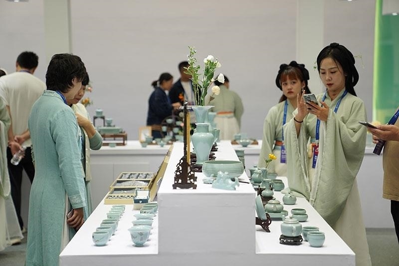 △2023年10月18日,人們在2023中國景德鎮(zhèn)國際陶瓷博覽會(huì)汝窯展臺(tái)參觀。