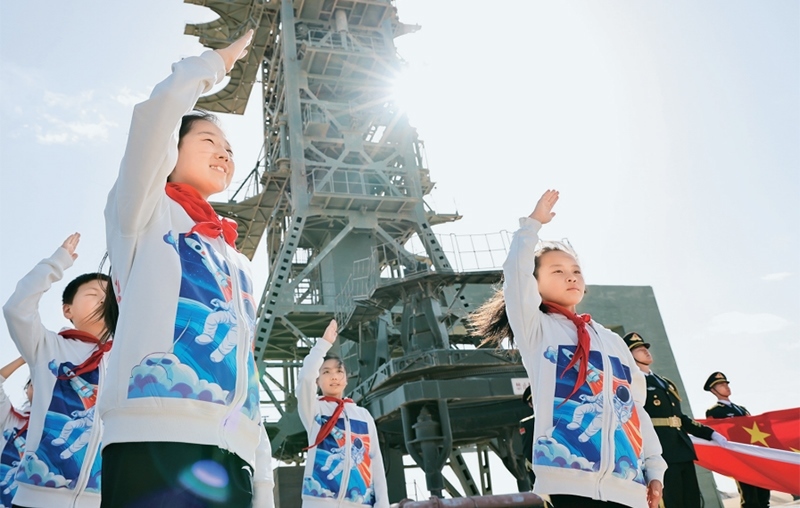 少先隊(duì)是建設(shè)社會(huì)主義和共產(chǎn)主義的預(yù)備隊(duì)。廣大少先隊(duì)員在少先隊(duì)這所大學(xué)校里立志向、修品行、練本領(lǐng),從小培養(yǎng)熱愛黨、熱愛祖國、熱愛人民的情懷,展現(xiàn)出朝氣蓬勃的精神風(fēng)貌。2024年4月24日是第九個(gè)“中國航天日”,“紅領(lǐng)巾愛祖國——我心中的五星紅旗”主題活動(dòng)在中國酒泉衛(wèi)星發(fā)射中心東方紅衛(wèi)星發(fā)射場舉行。圖為當(dāng)日,來自內(nèi)蒙古、甘肅、四川等地的少先隊(duì)員在中國酒泉衛(wèi)星發(fā)射中心東方紅衛(wèi)星發(fā)射塔架下敬隊(duì)禮。 新華社記者 金立旺/攝