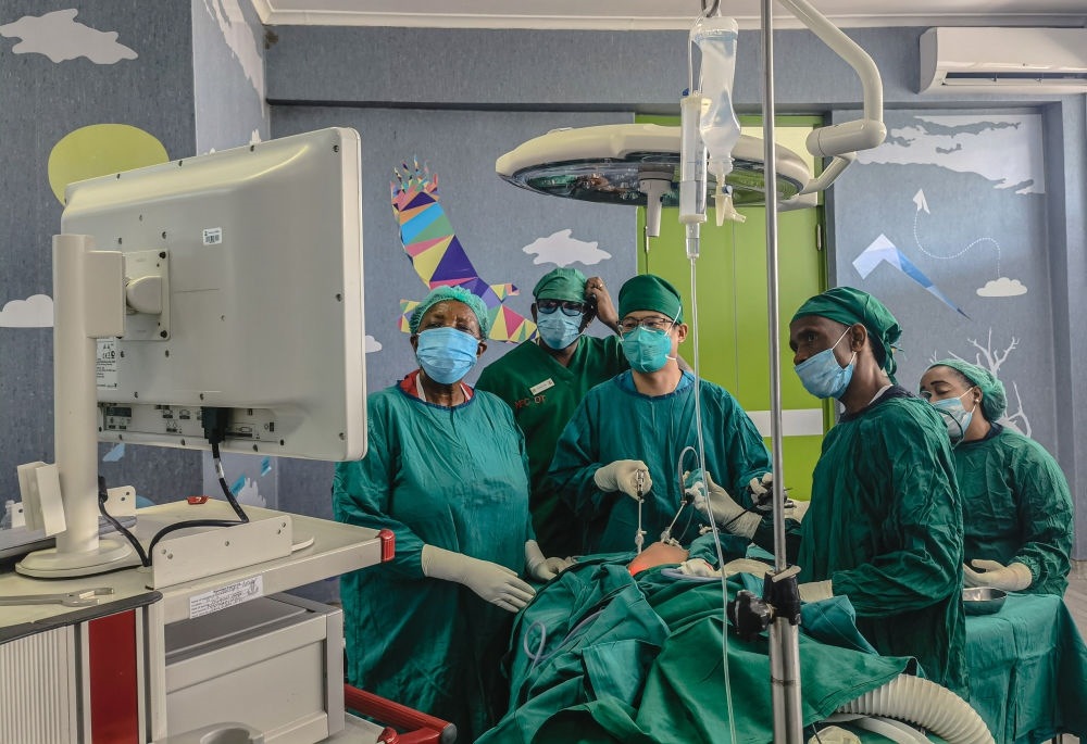 2022年10月26日,中國援坦桑尼亞醫(yī)療隊小兒外科醫(yī)生丁國建(中)在坦桑尼亞達累斯薩拉姆的穆欣比利國立醫(yī)院實施小兒腹腔鏡手術(手機照片)。
