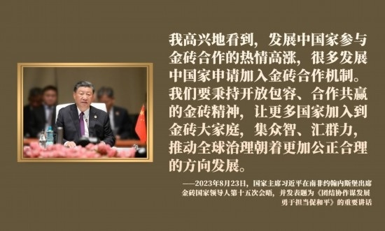 中國一直是金磚擴員的積極推動者。從2017年中國提出“金磚+”合作模式、首次將金磚合作伙伴對象擴大至全球范圍,到如今實現(xiàn)歷史性擴員,金磚成色更足、分量更重、影響更大。