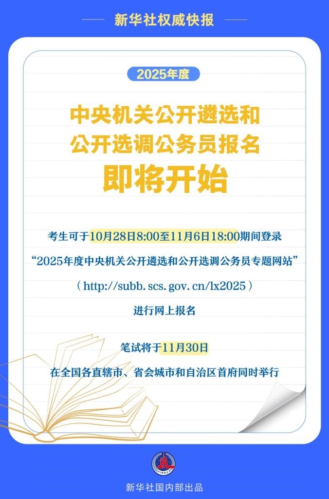 新華社北京10月27日電記者27日從國家公務(wù)員局獲悉,2025年度中央機關(guān)公開遴選和公開選調(diào)公務(wù)員報名即將開始,考生可于10月28日8:00至11月6日18:00期間,登錄“2025年度中央機關(guān)公開遴選和公開選調(diào)公務(wù)員專題網(wǎng)站”(http://subb.scs.gov.cn/lx2025)進行網(wǎng)上報名,筆試將于11月30日在全國各直轄市、省會城市和自治區(qū)首府同時舉行。