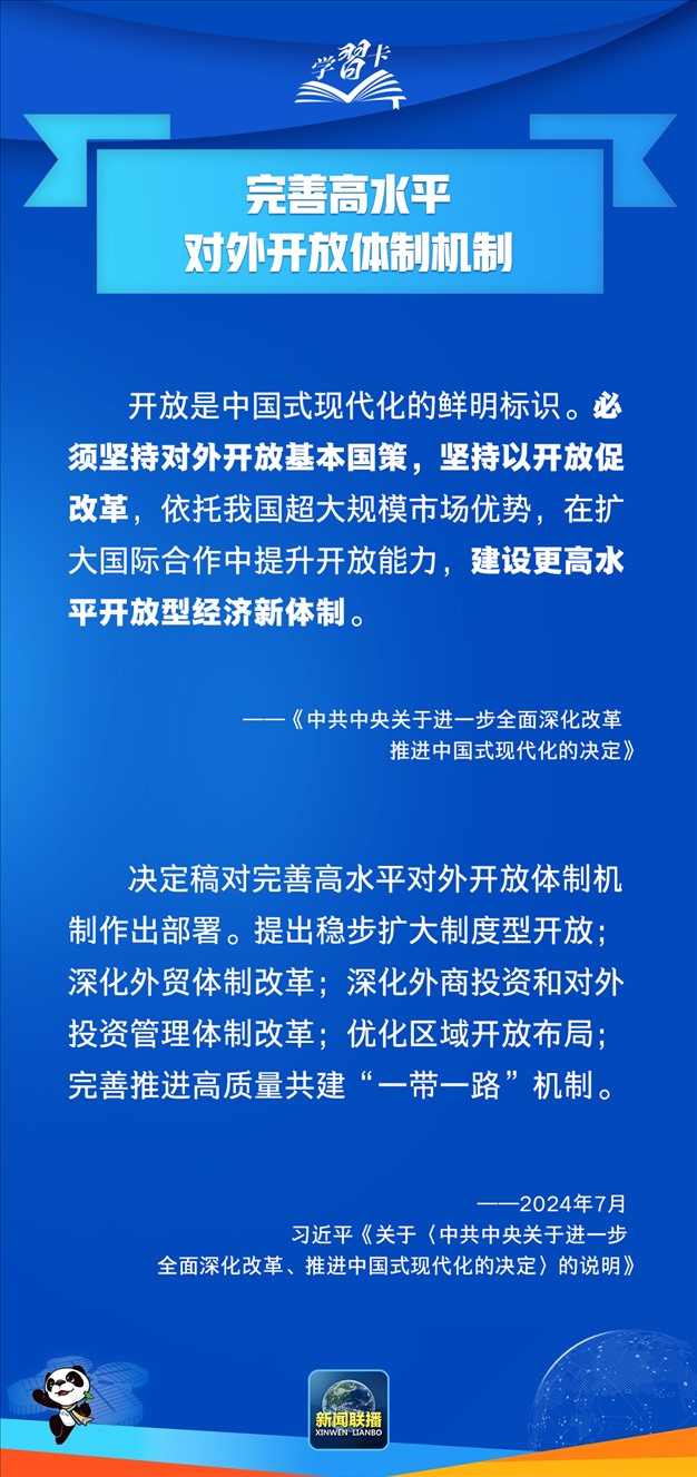 今年7月,黨的二十屆三中全會(huì)審議通過(guò)《中共中央關(guān)于進(jìn)一步全面深化改革 推進(jìn)中國(guó)式現(xiàn)代化的決定》。這份綱領(lǐng)性文件明確提出,“完善高水平對(duì)外開(kāi)放體制機(jī)制”。