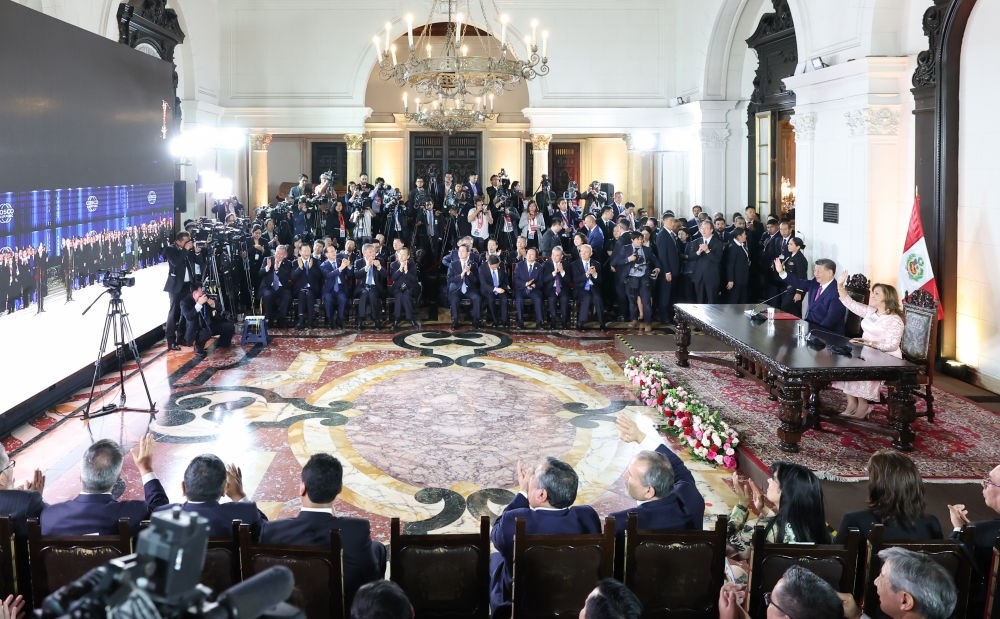當?shù)貢r間11月14日晚,國家主席習近平同秘魯總統(tǒng)博魯阿爾特在利馬總統(tǒng)府以視頻方式共同出席錢凱港開港儀式。