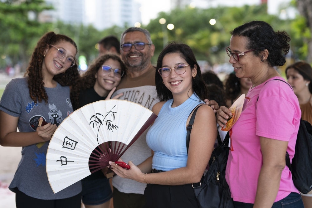 2024年2月3日,一名女子在巴西累西腓舉行的中國春節(jié)慶祝活動上展示自己書寫的扇面。