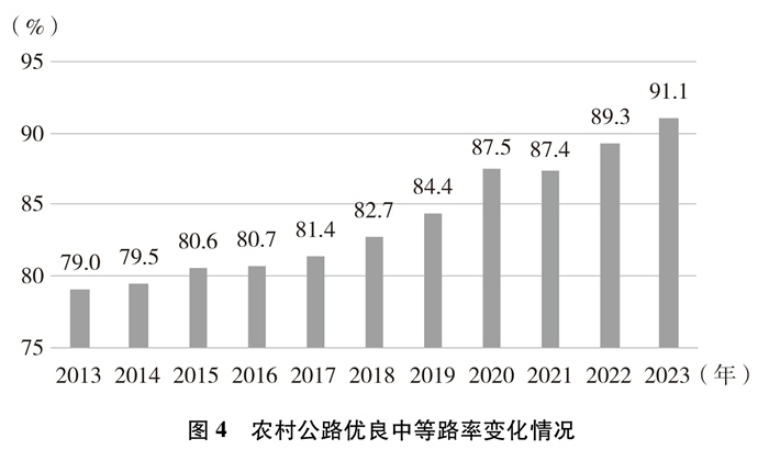 路況水平實現(xiàn)跨越式提升。持續(xù)加大養(yǎng)護投入,全面開展日常養(yǎng)護,大力實施養(yǎng)護工程,農村公路養(yǎng)護工程年均比例超5%。十年來,累計實施修復養(yǎng)護工程184萬公里,優(yōu)良中等路率④從79%上升至91.1%,基本實現(xiàn)“有路必養(yǎng)、養(yǎng)必到位”。