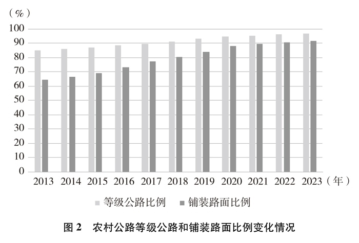 技術等級逐年提高。截至2023年底,農村公路等級路②里程及比例分別達到445萬公里和96.8%,鋪裝路面里程及比例分別達到422萬公里和91.8%,十年間分別提高了11.9個百分點、27.2個百分點。