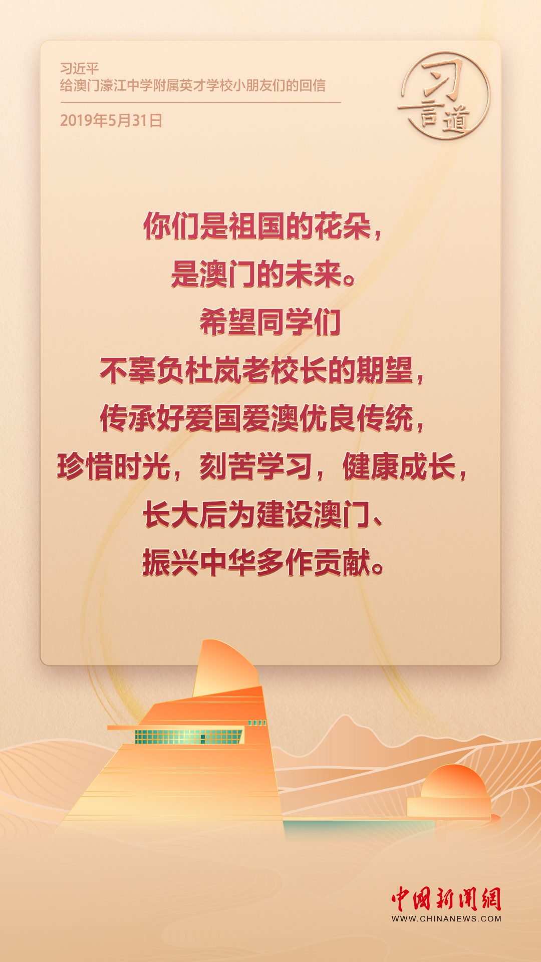 2024年是澳門回歸祖國25周年。多年來,習近平主席始終關注澳門經濟社會發(fā)展、百姓福祉,寄語“澳門的發(fā)展厚積薄發(fā)、未來可期”。