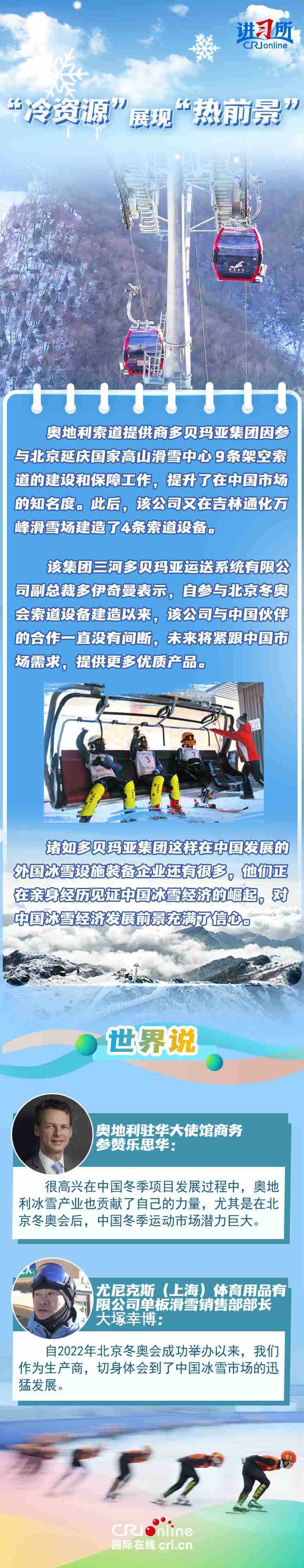 去年年底,中國(guó)國(guó)務(wù)院辦公廳印發(fā)《關(guān)于以冰雪運(yùn)動(dòng)高質(zhì)量發(fā)展激發(fā)冰雪經(jīng)濟(jì)活力的若干意見(jiàn)》,旨在鞏固和擴(kuò)大“帶動(dòng)三億人參與冰雪運(yùn)動(dòng)”成果,以冰雪運(yùn)動(dòng)為引領(lǐng),帶動(dòng)冰雪文化、冰雪裝備、冰雪旅游全產(chǎn)業(yè)鏈發(fā)展,推動(dòng)冰雪經(jīng)濟(jì)成為新增長(zhǎng)點(diǎn)。不少國(guó)際組織、企業(yè)和媒體認(rèn)為,中國(guó)冰雪經(jīng)濟(jì)的蓬勃發(fā)展,不僅帶來(lái)新合作機(jī)遇,更為全球冰雪市場(chǎng)貢獻(xiàn)力量。